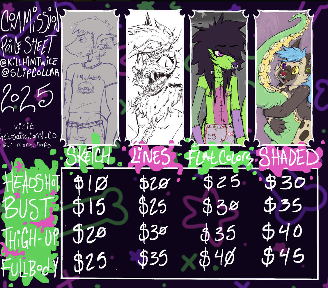 HI!!! i'm slipcollar, i'm a 21 year old artist in the US! if you're interested in a commission from me press the button below for my terms of service :3